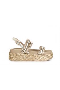 Colour block sandals in woven raffia with rhinestone insert. comfortable footbed and raffia-clad wedge.