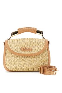 Raffia handbag with an elegant flap and contrasting leather-look trim. featuring an internal zip compartment a metal lettering patch a woven metal handle and a removable shoulder strap. dimensions: 27 cm (length) × 18 cm (height) × 10 cm (depth).