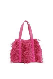 raffia shopping bag with fringes and decorative buttons hot pink