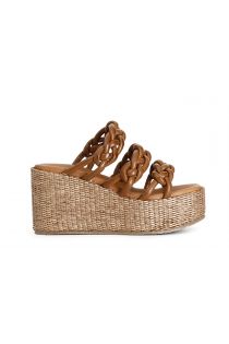 Slippers with three interlaced feature bands. padded raffia wedge.