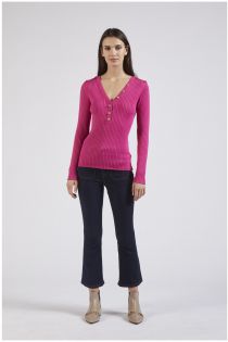 Grandad v-neck sweater with long sleeves rib knit viscose yarn. personalised plates at the shoulders and personalised buttons at the neckline.