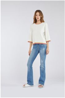 Ribbed viscose yarn boat neck loose sweater. A delicate striped pattern that contrasts the rest of the garment enhances the hem and the trim of the sleeves
