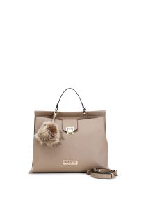saffiano effect faux leather shopper with faux fur pom pom