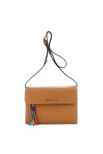 Saffiano leather-look shoulder bag with flap and flat front pocket. Interior features a tone-on-tone logo partition and multicolored charm. Adjustable shoulder strap.
