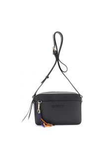 Saffiano leather-look camera bag with a flat front pocket, tone-on-tone logo, and multicolored cord charm. Slim, adjustable shoulder strap for a practical look.