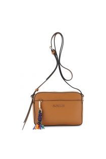 Saffiano leather-look camera bag with a flat front pocket, tone-on-tone logo, and multicolored cord charm. Slim, adjustable shoulder strap for a practical look.