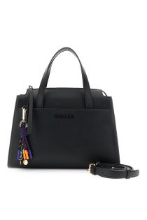 Saffiano leather-look satchel bag with a flat front pocket, tone-on-tone logo, and multicolored drawstring charm. Detachable shoulder strap for dual carry.