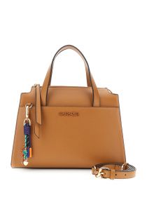 Saffiano leather-look satchel bag with a flat front pocket, tone-on-tone logo, and multicolored drawstring charm. Detachable shoulder strap for dual carry.