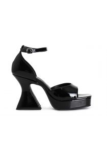 Patent leather-effect sandals with reinforced heel and ankle strap. 90mm-high reel heel and platform. comfortable shoe characterised by its square toe. simple wrap-around upper.