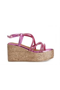 sandals with rhinestone crossover straps on raffia wedge hot pink