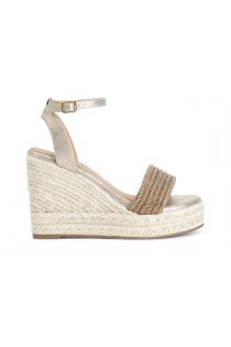 Sandals with mignons rhinestone decoration on the upper. 10.5 cm rope wedge and 3.5 cm platform. ankle strap. leather insole.