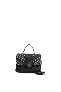 Satchel model handbag with quilted flap dotted with rows of semi-spherical studs of various sizes and metal CafèNoir accessory on the front