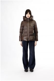 shiny and opaque fabric down jacket dark brown