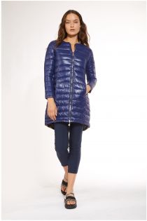 Reversible down jacket made of light nylon with a shiny effect. Made in three versions with different colours one side in a solid colour and the other patterned. Front zip, crew-neck and longer back with a drawstring
