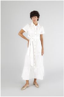 Long shirt dress with flounce. front closure with buttons and sash at the waist. short sleeves with cuffs. must to have for the summer thanks to its simplicity and versatility. lightweight dress will accompany you from morning to evening.