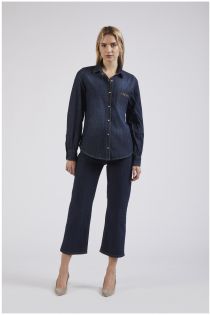 Lightweight denim canvas shirt with gathered sleeves. customised plate to finish the pocket.