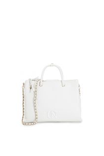 Tote with tubular handles. all-over embossed logo and tone-on-tone accessory. braided zip puller with charm. cross-body bag with chain included.