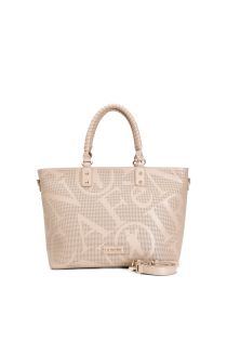 Unlined shopper with all-over laser-printed maxi logo. machined handles. zip closure. inner compartment with zipped pocket. bag with shoulder strap.