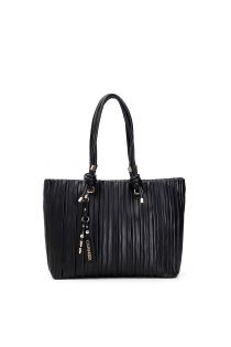 Shopper in soft material with characteristic wavy pleating and knotted handles with contrasting colour embellished by Cafènoir pendant accessory