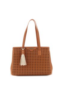 shopping bag in leather-effect material with elegant geometric perforation on the front tan