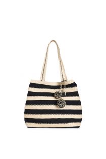 Striped raffia and canvas shopping bag with pompom charm and metal logo plate. closure with magnet and carabiner. perfect for a chic summer look