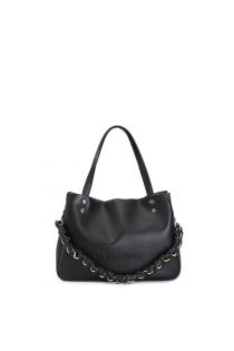 Shopping bag with cafènoir firenze logo embossed with long handles and woven chain shoulder strap. zipper closure.