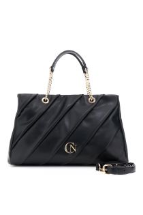 Faux leather shopping bag with front pleating, back zip pocket, and internal divider. Padded handles with metal Café Noir logo chain and removable shoulder strap.