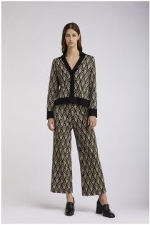Short cardigan with long sleeves and polo-style collar made of jacquard fabric with geometric design.