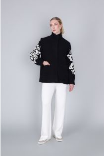 Women's short coat in warm fabric with exclusive contrasting embroidery on the sleeves. A casual piece with a unique design, perfect for refined and distinctive looks. Regular fit. The model is 174 cm tall and wears size S.