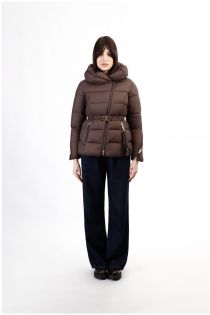Short down jacket with enveloping collar and logoed belt at the waist. made of matt nylon. versatile and practical an essential item in the wardrobe of the new autumn winter season.