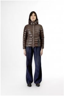Short down jacket with belt with logo buckle made of ultraligth nylon with a shiny finish. removable hood. versatile and practical an essential item in the wardrobe of the new autumn winter season.