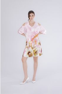 short dress with portholes on the shoulders in printed satin pink gradient flower