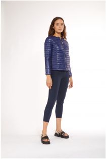 Short reversible down jacket made of light nylon with a shiny effect. Made in three versions with different colours one side in a solid colour and the other patterned. Front zip, crew-neck