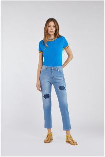 Ribbed viscose yarn short-sleeved sweater. A delicate striped pattern that contrasts the rest of the garment enhances the neckline and the trim of the sleeves