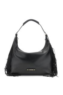 Faux leather shoulder bag with side fringes and a metal logo on the front. A bold and trendy accessory perfect for bold looks.