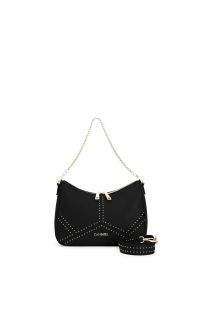 Shoulder bag with patchwork workmanship and micro rivet applications. bag divided into various compartments: a partition closed with zip and pocket. double shoulder strap both in chain and in the same material as the bag.