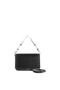 Shoulder bag with flap decorated with two-tone mini rivets and contrasting ribs. equipped with zipped partition short shoulder strap with shoulder pad and removable shoulder strap.