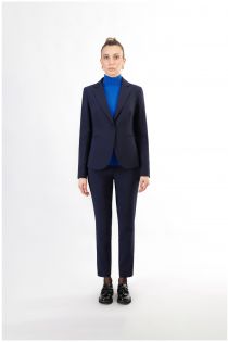 The single-breasted jacket is characterized by peak lapels welt pockets single button and elegant flower brooch. timeless garment in bi-stretch fabric to match with a pair of skinny or flared trousers.