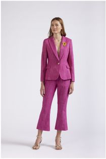 Single-breasted jacket made of cotton denim-like fabric. removable crochet accessory applied to the lapel. welt pockets with flap