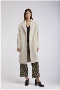 Single-breasted coat with patch pockets made of a poly-viscose cloth with a resca pattern.