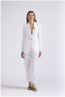 Single-breasted jacket made of a cool linen-blend fabric. the jacket is embellished with a delicate removable crocheted flower accessory. gold button fastening and welt pockets with flaps.