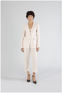 Unlined single-breasted jacket made of pinstripe linen fabric. one button closure and welt pockets with flap. complete the look with matching top and trousers. the lightweight fabric accompanies your looks throughout the spring-summer season.