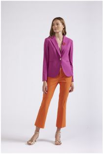Timeless single-breasted jacket in super-stretch fabric with a slubbed effect. the collar is enriched with a removable crocheted flower accessory. single gold button fastening and welt pockets.