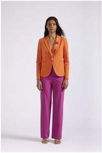 Timeless single-breasted jacket in super-stretch fabric with a slubbed effect. the collar is enriched with a removable crocheted flower accessory. single gold button fastening and welt pockets.