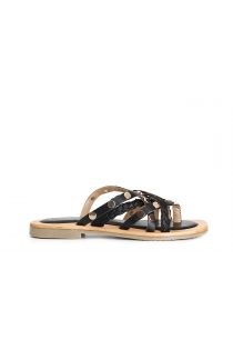 Low slipper sandals with alternating leather and raffia straps decorated with gold studs.