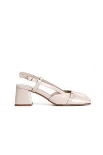 Patent leather open shoes with loafer effect border and jewelled buckle. rounded shoe shape. a mix between a loafer and a court shoe. lace at the back. 45mm-high heel. very comfortable perfect for everyday use.