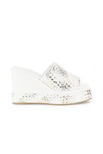 Slipper-style sandals with a laminated woven leather-effect wedge a wide strap and a summery design. comfortable and lightweight they're ideal for casual-chic looks. the 10.2 cm heel and 3.3 cm platform add a slimmer look without sacrificing comfort.