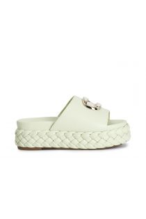High band slipper with golden clamp. comfortable fussbett and braid-covered bottom. the wedge is 6 cm high. shoe with a comfortable fit comfortable even after several hours of use.