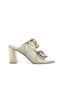Slipper with cord embroidery and double buckle. the insole is in leather. 8.5 cm high wide heel. elegant stylish and formal shoe.