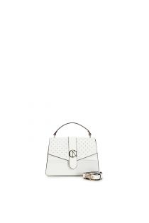 Small stiff satchel in saffiano material with closing flap embellished with micro studs and personalised with cafènoir charm which can be carried by hand or with a shoulder strap.